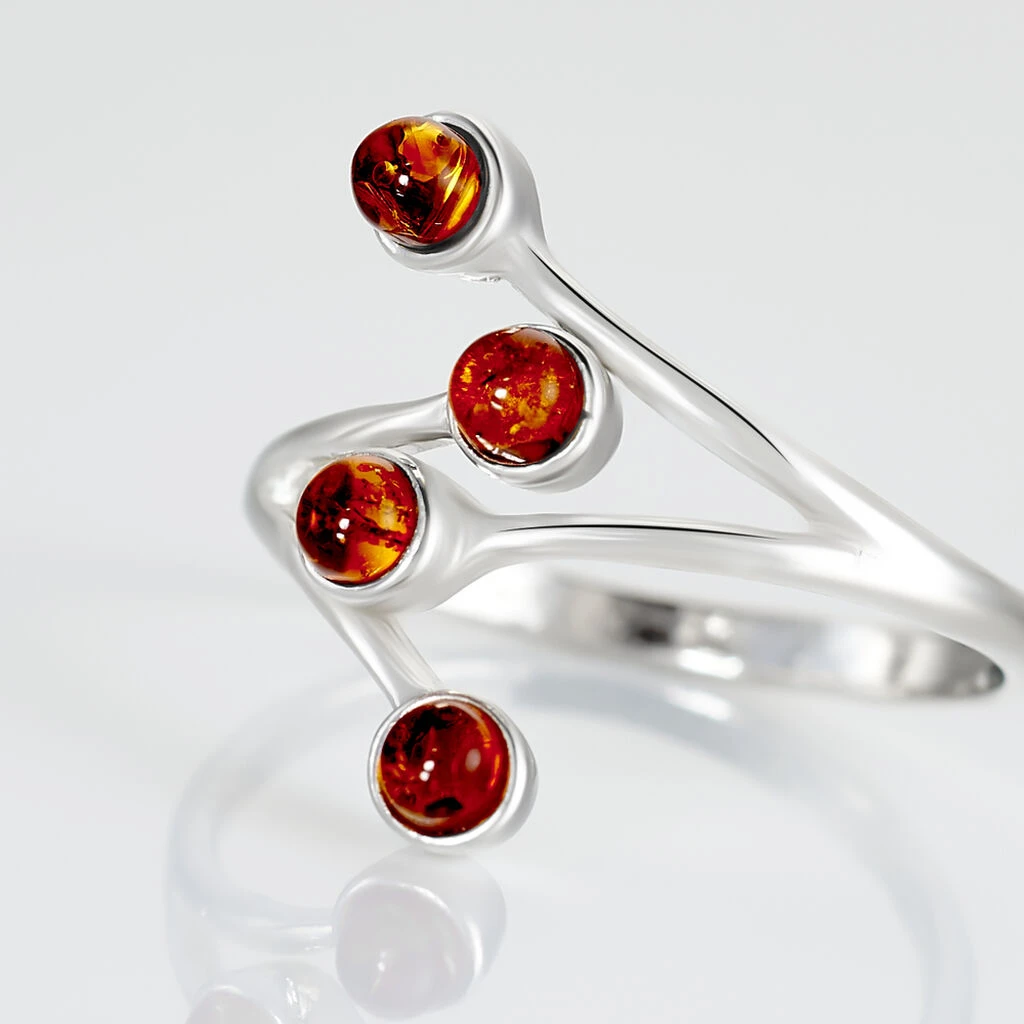 Bague Argent Blanc 925/1000 Billes Ambre Cognac