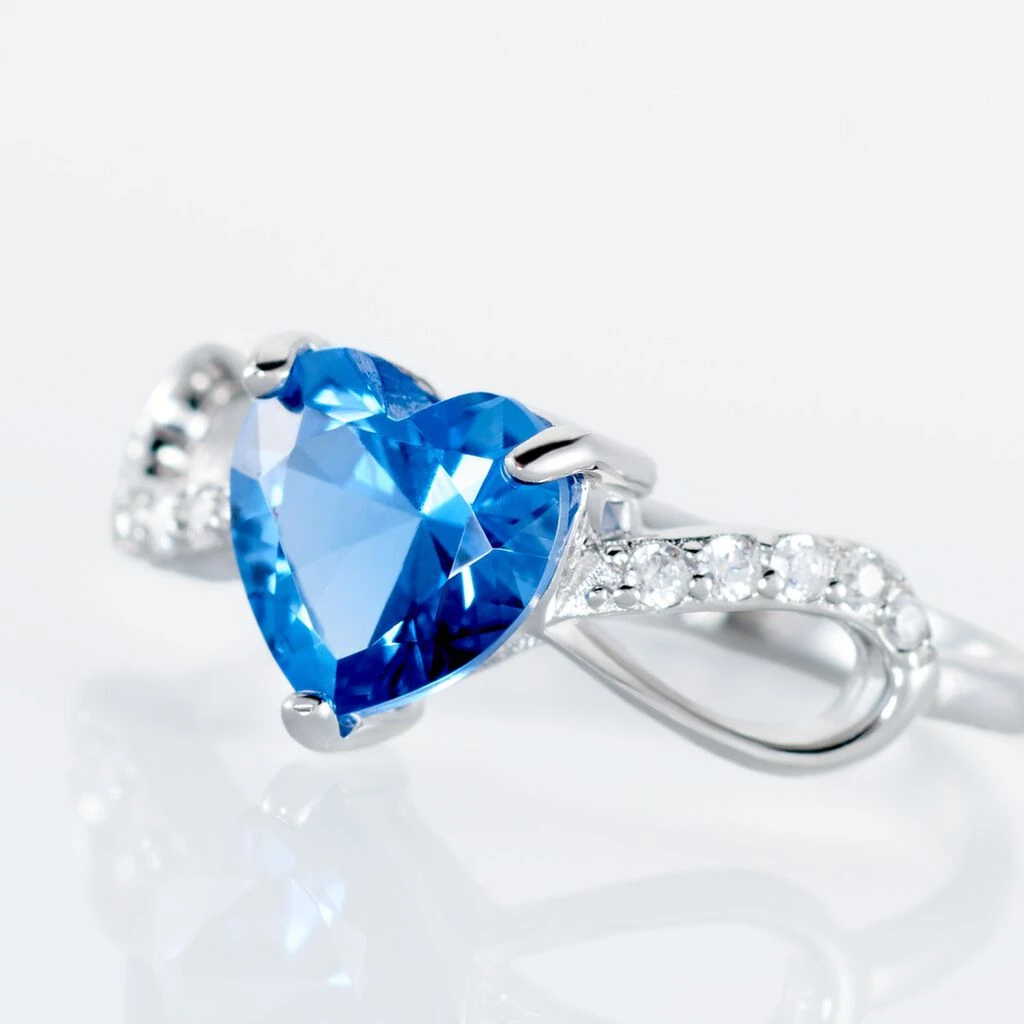 Bague Argent Blanc 925/1000 Cœur Serti Griffes Oxyde De Zirconium Bleu Accompagné