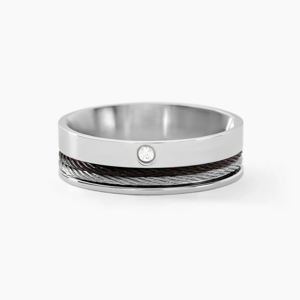 Moderne et stylé en même temps, cette bague en acier est parfaite pour compléter vos looks branchés. Original, son anneau est caractérisé par des câbles noir et gris argenté. Un diamant blanc est disposé en serti clos pour donner davantage de caractère à cette bague.