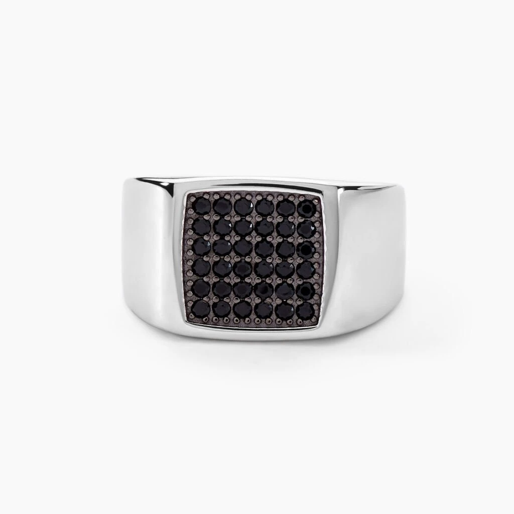 Chevaliere Argent Blanc 925/1000 Plateau Carre Oxydes De Zirconium Noirs
