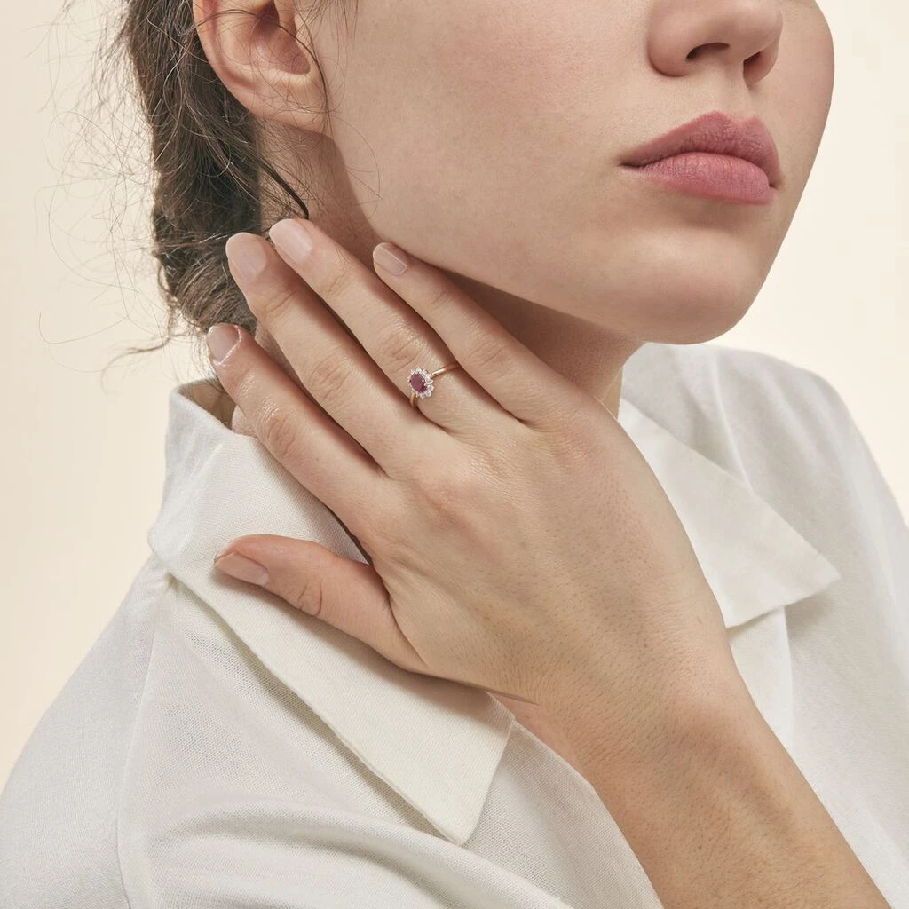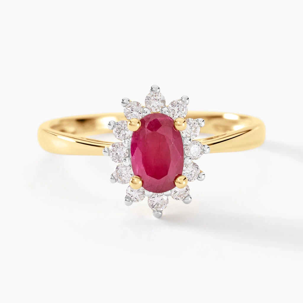 Bague Or Jaune 375/1000 Rubis Simple Entourage Diamants Blancs Pm