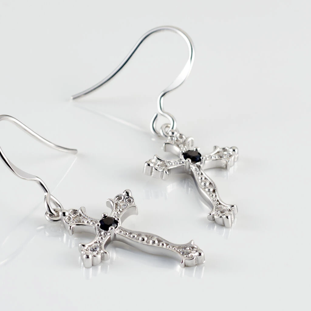 Boucles D’oreilles Pendantes Argent Blanc 925/1000 Croix Gothique Micro-setting Oxydes De Zirconium