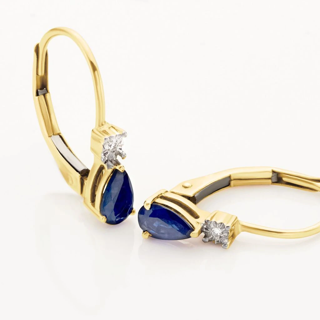 Boucles D’oreilles Pendantes Accompagnées Diamants Or Jaune 375/1000 Saphir Poire Serti Griffes 0.5cts