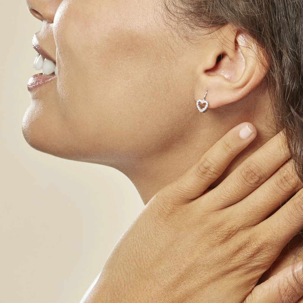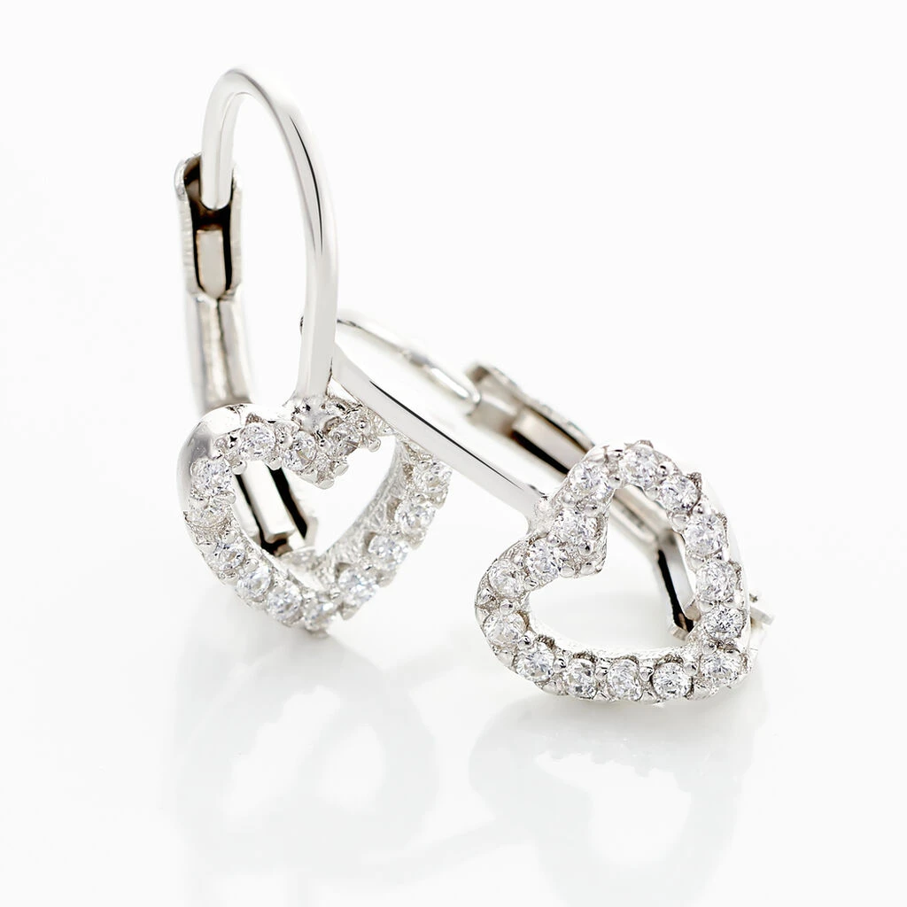 Boucles D’oreilles Pendantes Argent Blanc 925/1000 Style Dormeuse Motif Cœur Ajoures Paves Oxydes De Zirconium