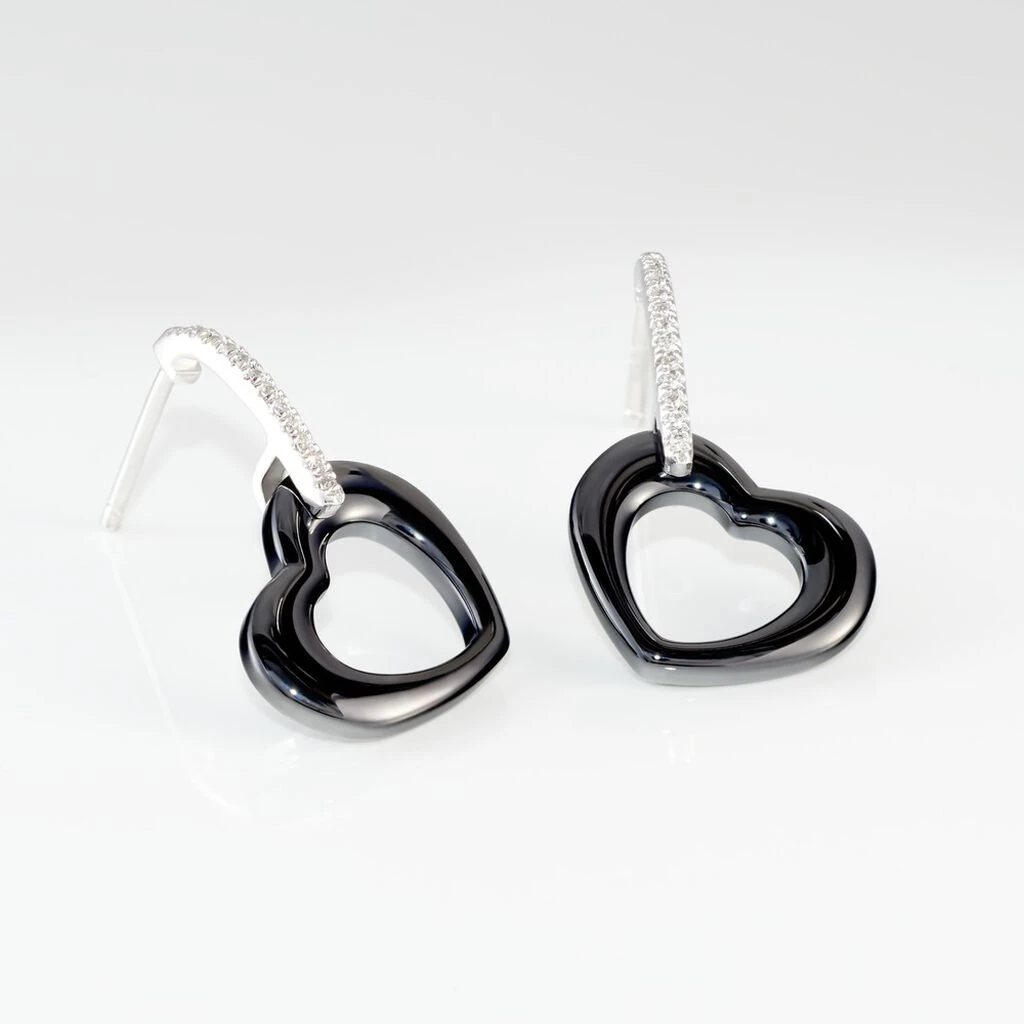 Boucles D’oreilles Pendantes Argent Blanc 925/1000 Coeurs Ceramique Noire Et Oxydes De Zirconium