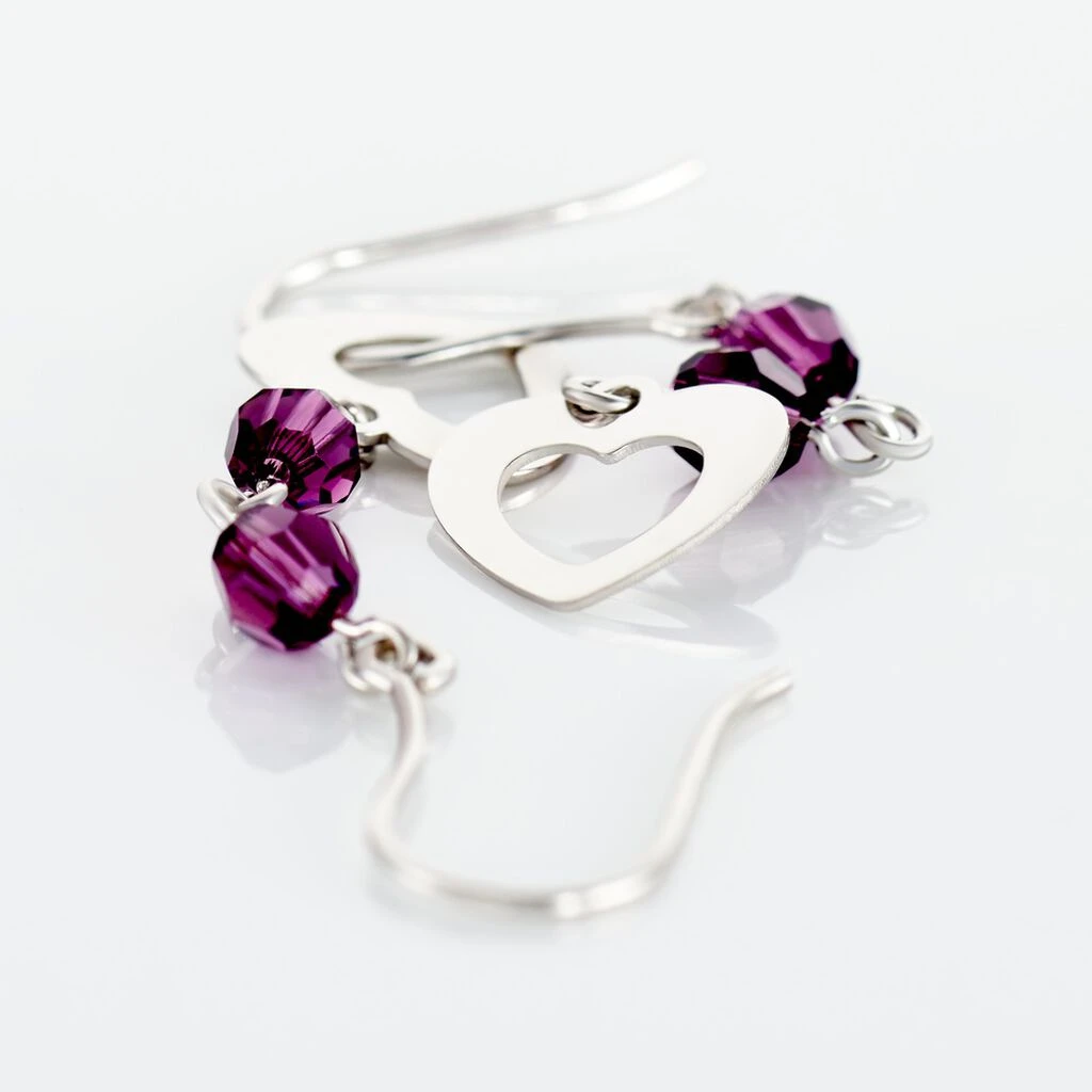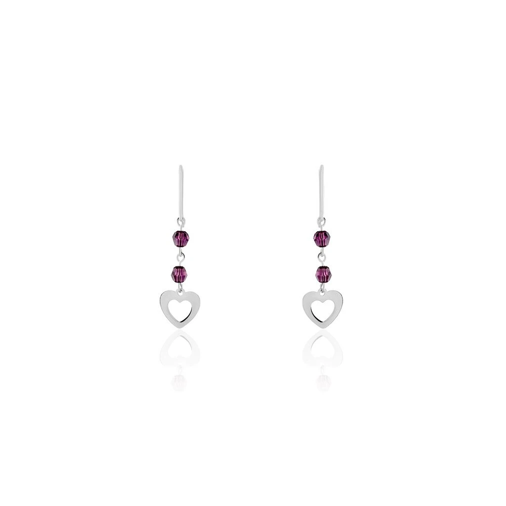 Boucles D’oreilles Pendantes Argent Blanc 925/1000 Coeurs Pierres Violettes