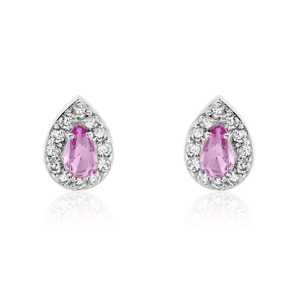 Boucles D’oreilles Puces Argent Blanc 925/1000 Gouttes Roses Entourage Sertis Griffes Oxydes De Zirconium