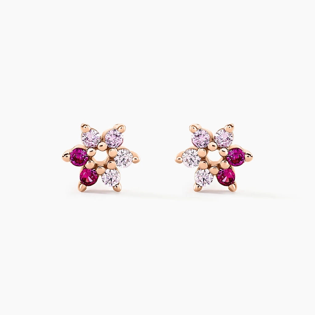 Boucles D’oreilles Puces Argent Rose 925/1000 Fleurs Camaieu Rose Serti Griffes Oxydes De Zirconium