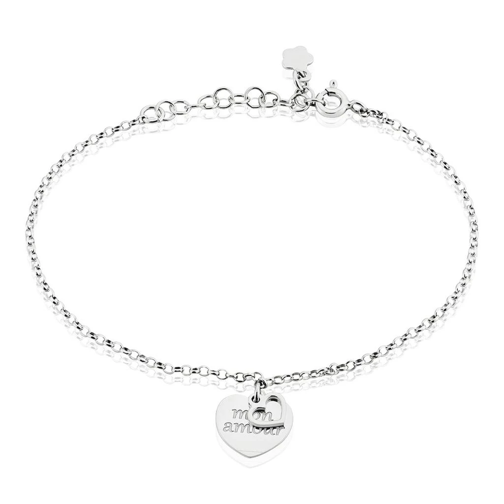 Bracelet Argent Blanc 925/1000 Double Cœurs Message Mon Amour Maille Jaseron 19cm