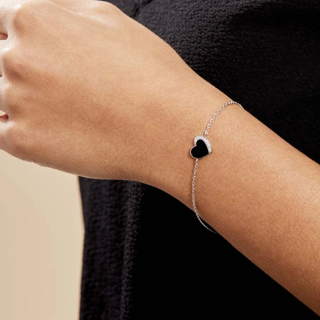 Bracelet Argent Blanc 925/1000 Cœur Email Noire Pavage Oxydes De Zirconium Maille Forcat 16+3cm