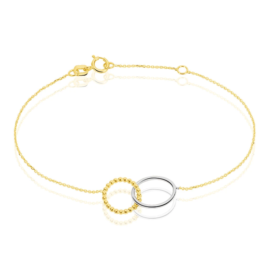 Bracelet Or Bicolore 375/1000 Double Cercles Ajoures Effet Perle Et Lisse Maille Jaseron 18cm