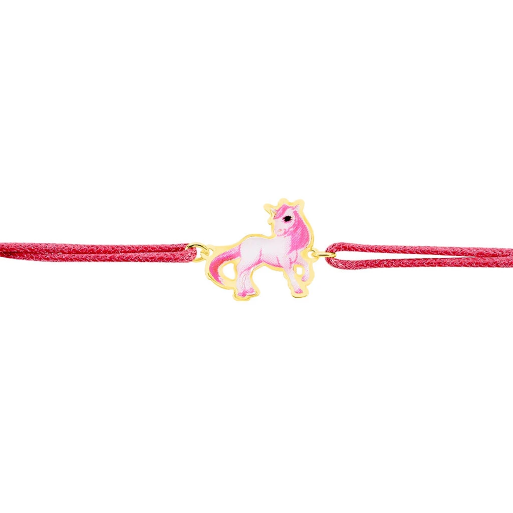 Bracelet Or Jaune 375/1000 Motif Poney Smalto Rose Cordon Rose