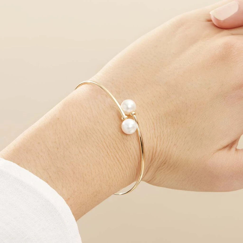 Bracelet Or Jaune 375/1000 Jonc Flexible Avec Double Perles De Culture Blanches