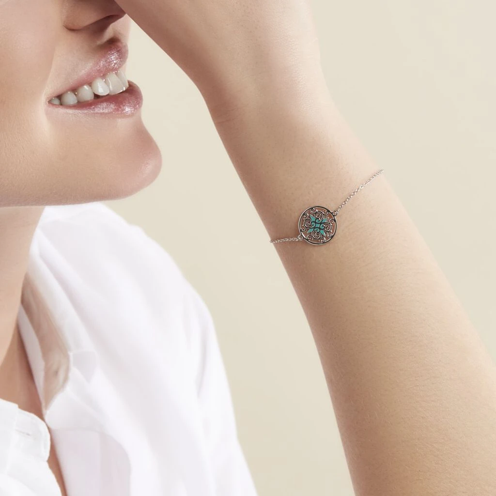 Bracelet Argent 925/1000 Rosace Email Turquoise Maille Forçat 19cm