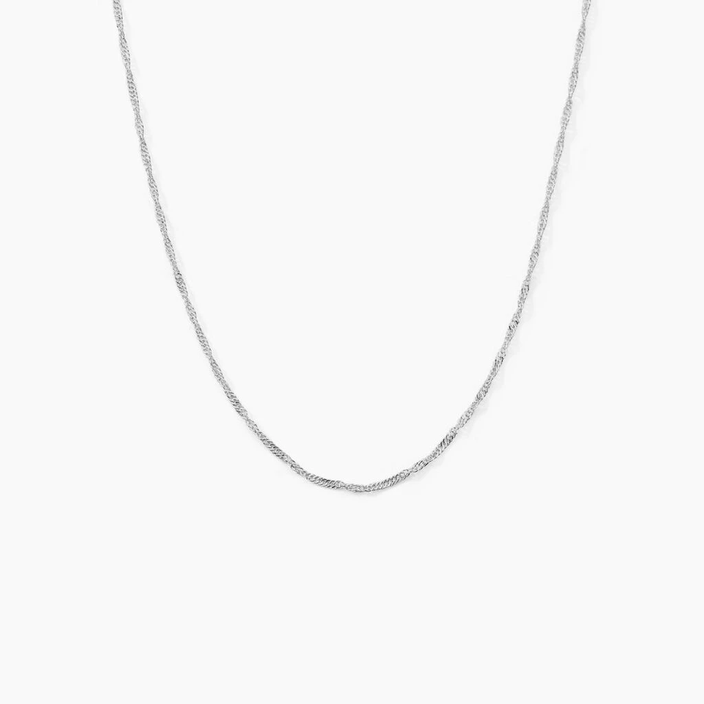 Cette chaîne en or blanc 375/1000ème apporte une finition raffinée à votre look. C’est un modèle intemporel qui se démarque par l’originalité de sa maille Singapour. Élégante et délicate, elle souligne gracieusement votre décolleté. Cette ravissante chaîne mesure 45 cm de longueur et 0,90 mm de largeur. Elle existe en or jaune.