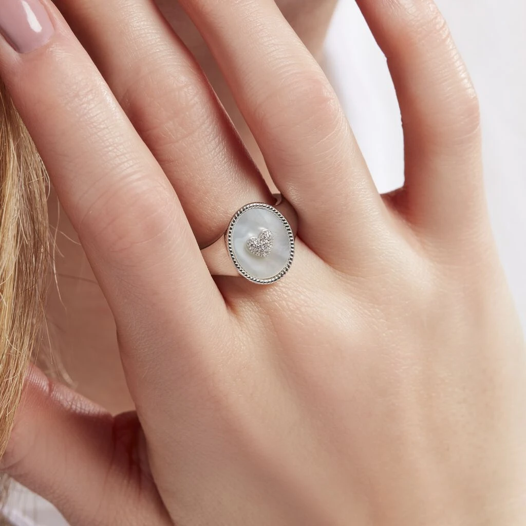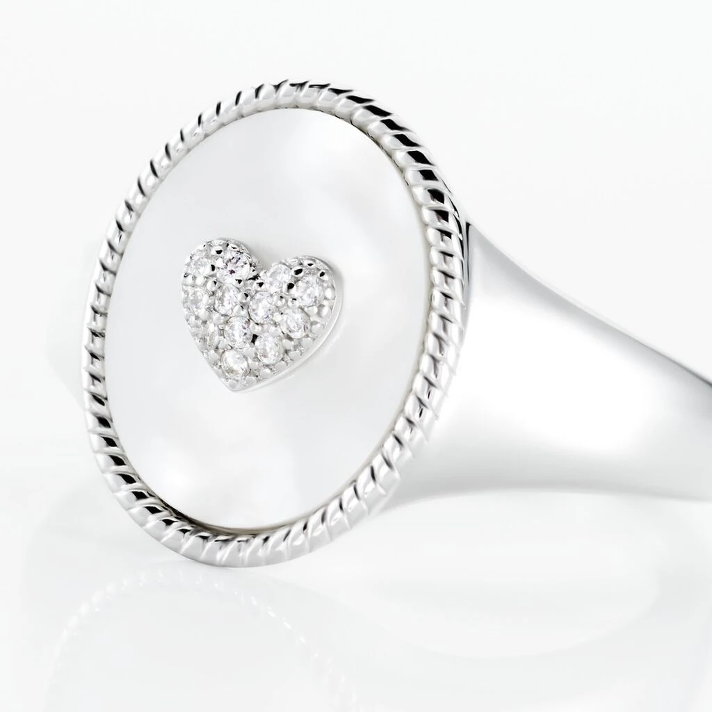 Chevalière Argent Blanc 925/1000 Ovale Nacre Et Motif Cœur Serti Griffes Oxydes De Zirconium