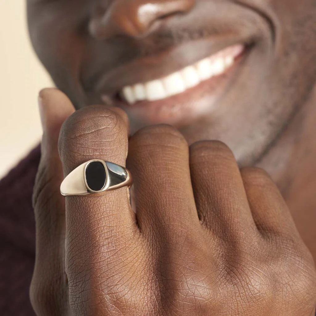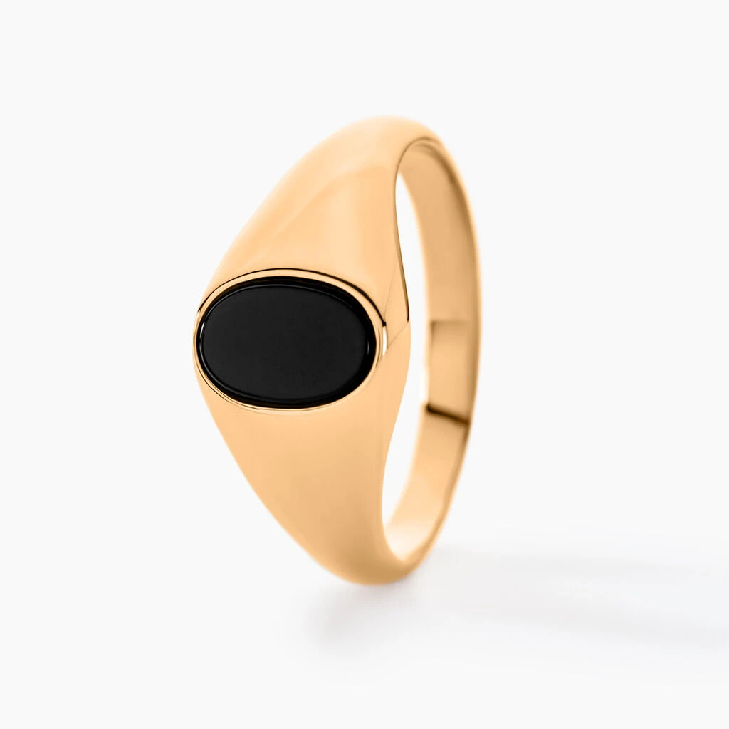 Chevaliere Plaqué Or Jaune Plateau Ovale Pierre Noire