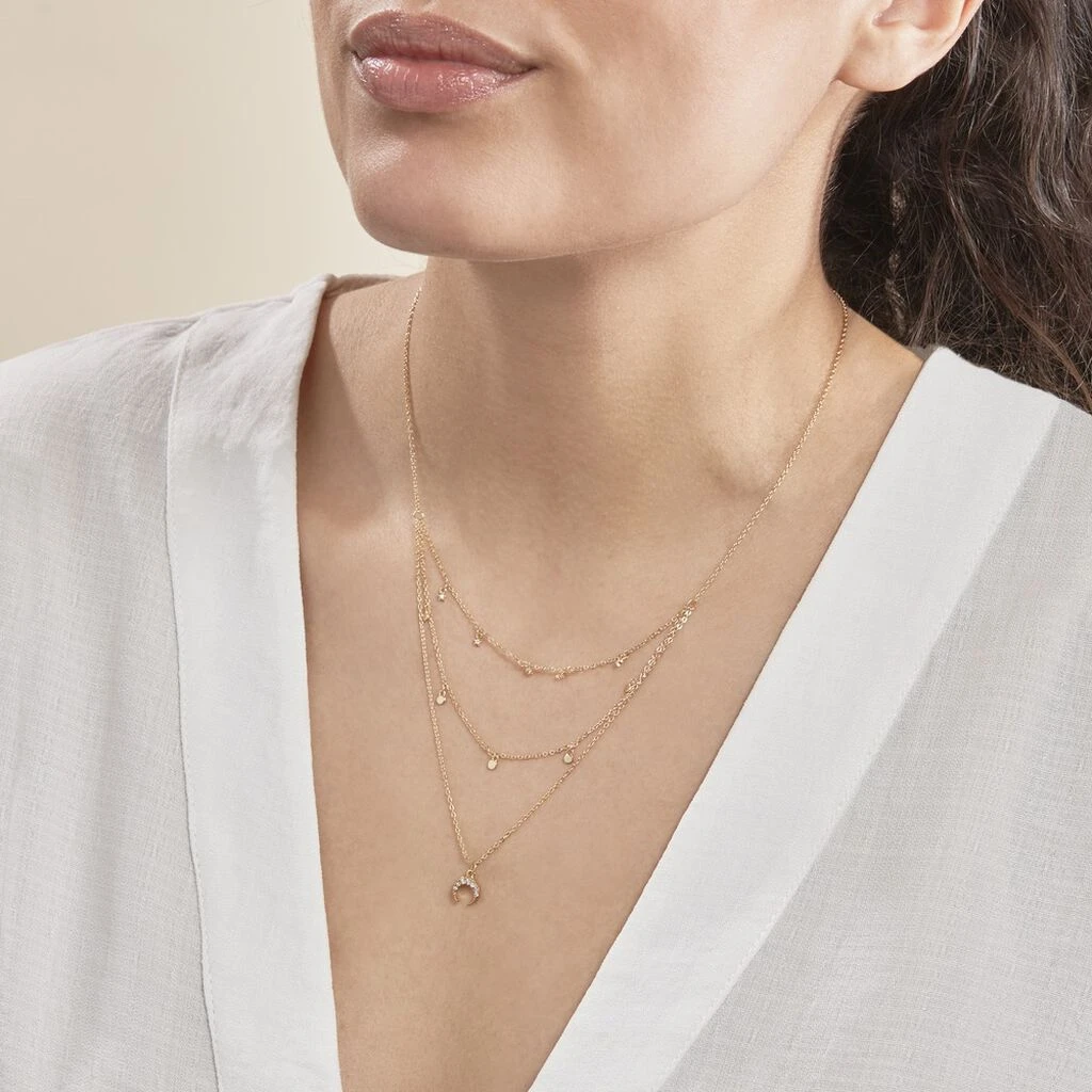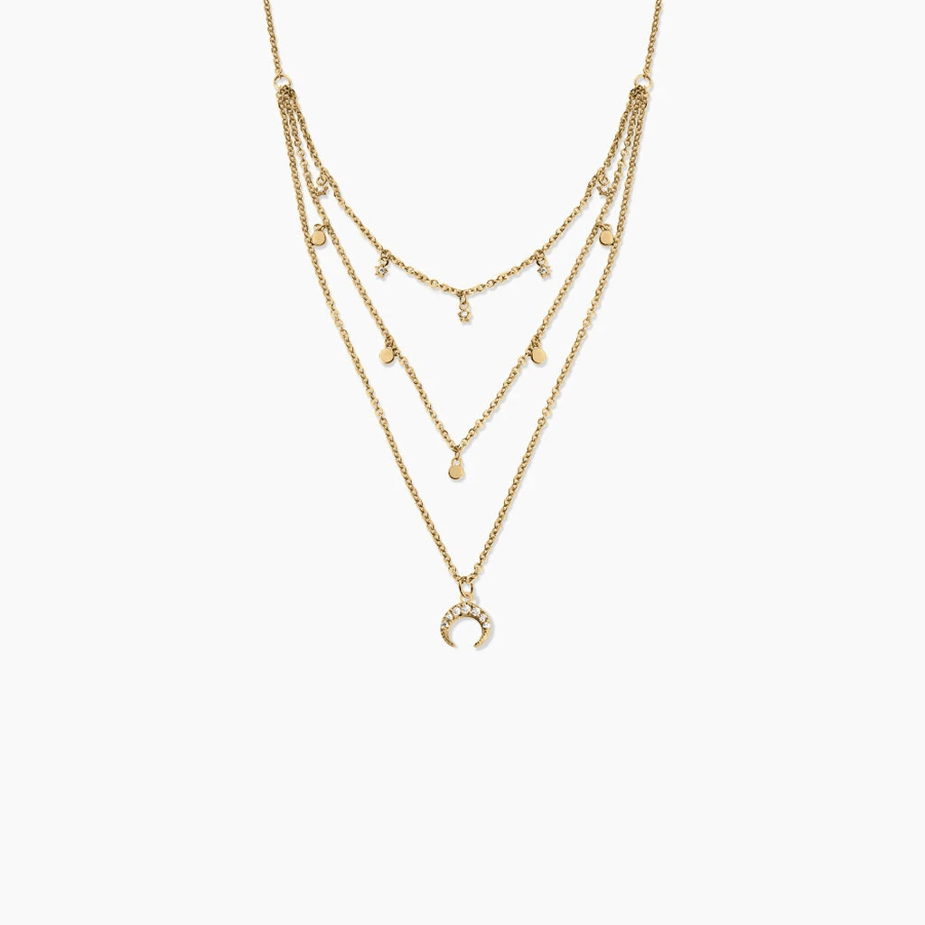 Collier Plaqué Or Jaune Lune Et Pampilles Triple Chaines Oxydes De Zirconium 48cm