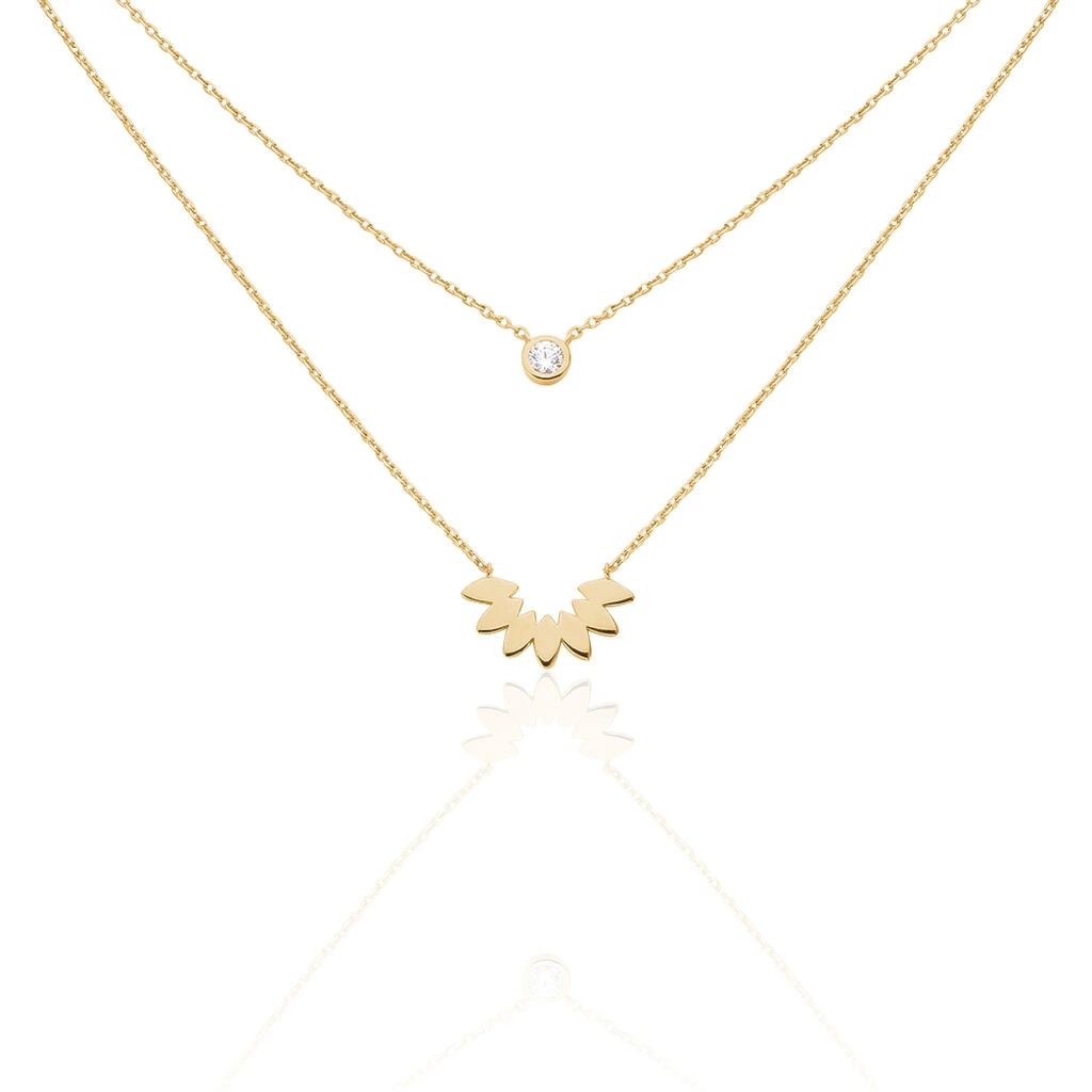 Collier Plaqué Or Jaune Double Chaines Motif Demi Fleur Et Oxyde De Zirconium 45cm
