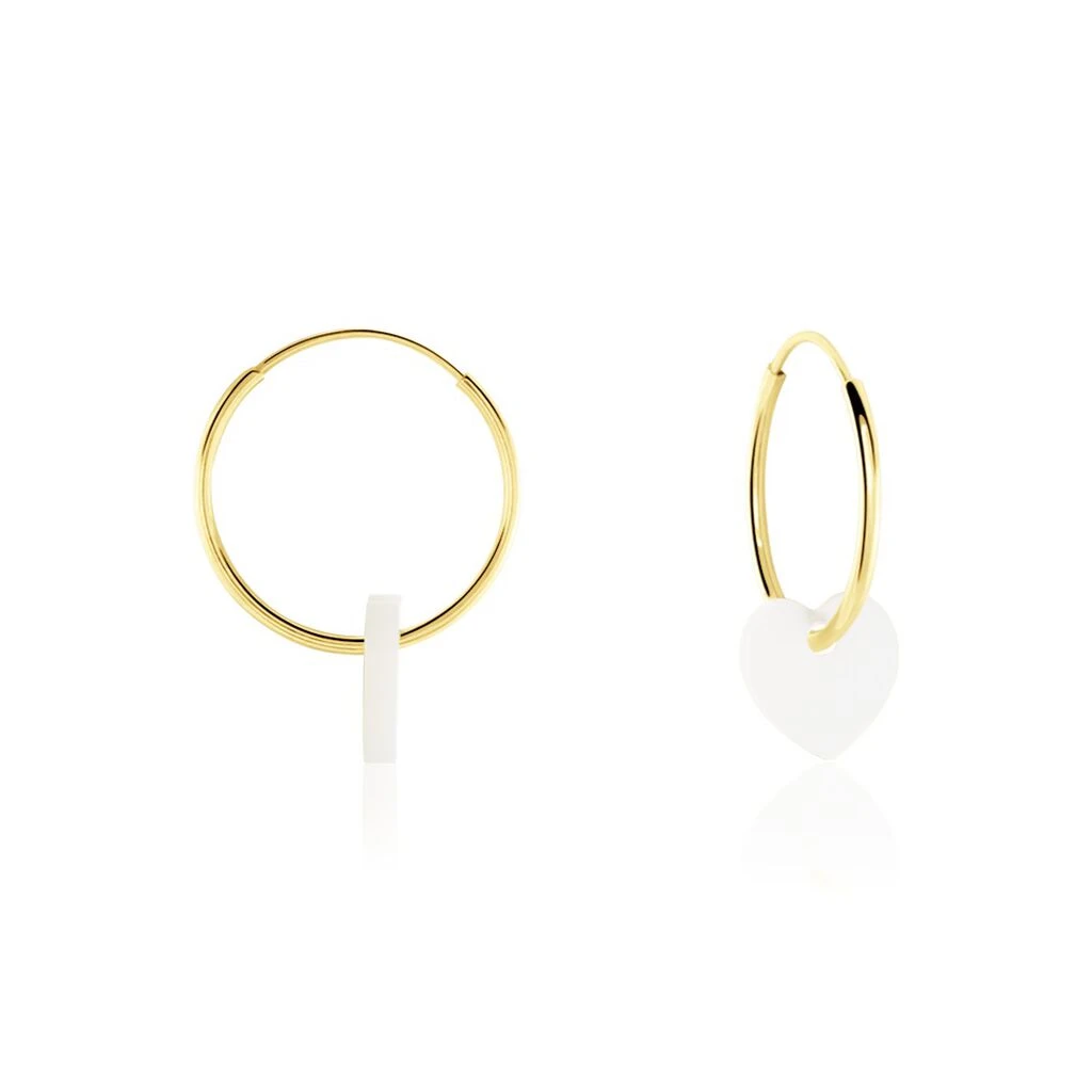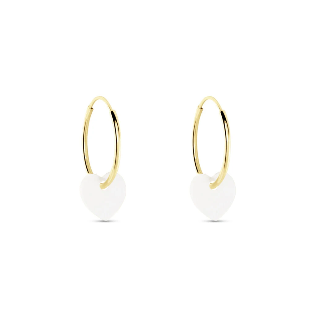 Creoles Or Jaune 375/1000 Pampilles Coeurs Nacre Blanche Largeur 0.8mm Diametre 11mm